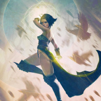 The image shows a female character, who appears to be a brunette, in the midst of an action pose. She is wearing armor and has her hand outstretched, as if casting or controlling something. The background suggests a magical or mystical setting with swirling energy and birds flying around.