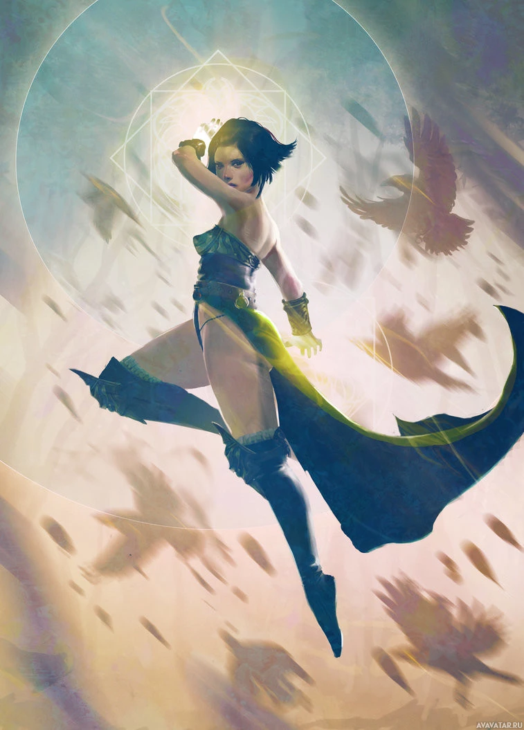 Картинка показывает женский персонаж, который кажется брюнеткой, в разгар боевой позы. Она носит доспехи и протягивает руку, как будто что-то бросает или контролирует. Фон предполагает магическую или мистическую обстановку с закрученной энергией и летающими вокруг птицами.