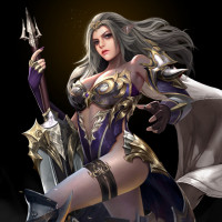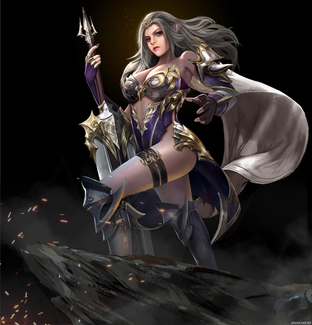 a fantasy character, which appears to be an elf. She is wearing armor and holding what seems to be a sword or spear in one hand while the other hand is resting on her hip. She has long