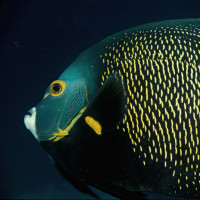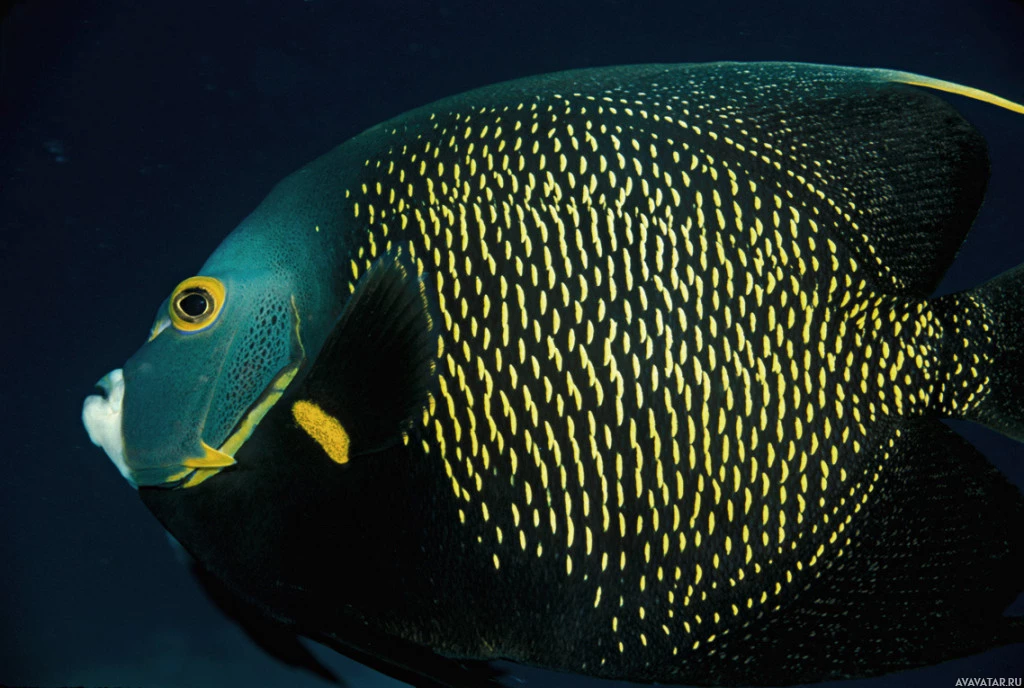 prominent eyes, a small mouth, and an elongated body covered in spots of varying shades.