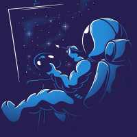 a starry sky with visible stars and nebulas, indicating that the setting could be a space station or a similar environment. The astronaut's hand holds a paintbrush, suggesting that they are engaged in