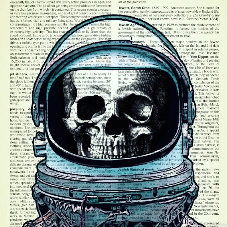 a space suit, but instead of a human head inside the helmet, there is a skull. This creates a contrasting theme where one might expect to see a living person, but instead sees an emblematic representation of death or mortality within the context of