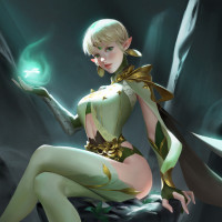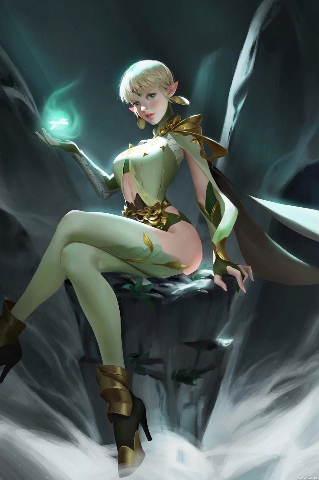 magical abilities. She is adorned with fantasy-inspired clothing and accessories that complement her elven features, which include