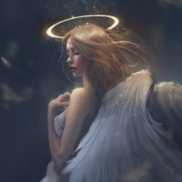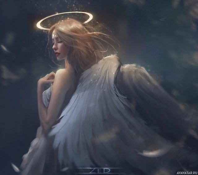 The image depicts a fantasy-themed illustration of an angel with human features, including wings and