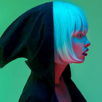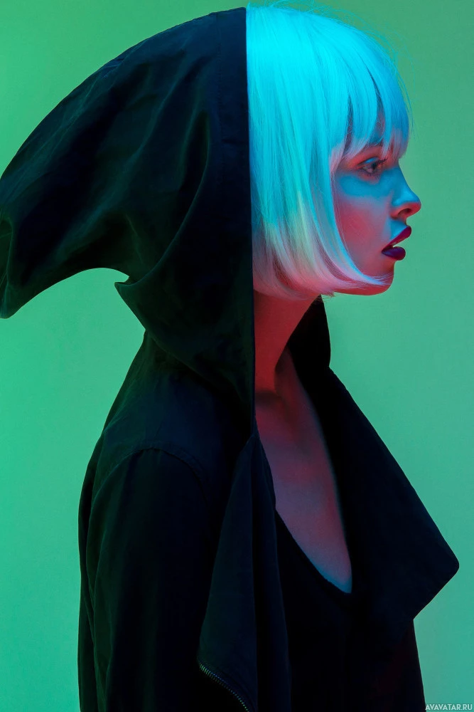 blue color, which contrasts with the black hood she is wearing and the grey background behind her. Her makeup appears to be dark around her eyes and lips, creating an asymmetrical look that complements her