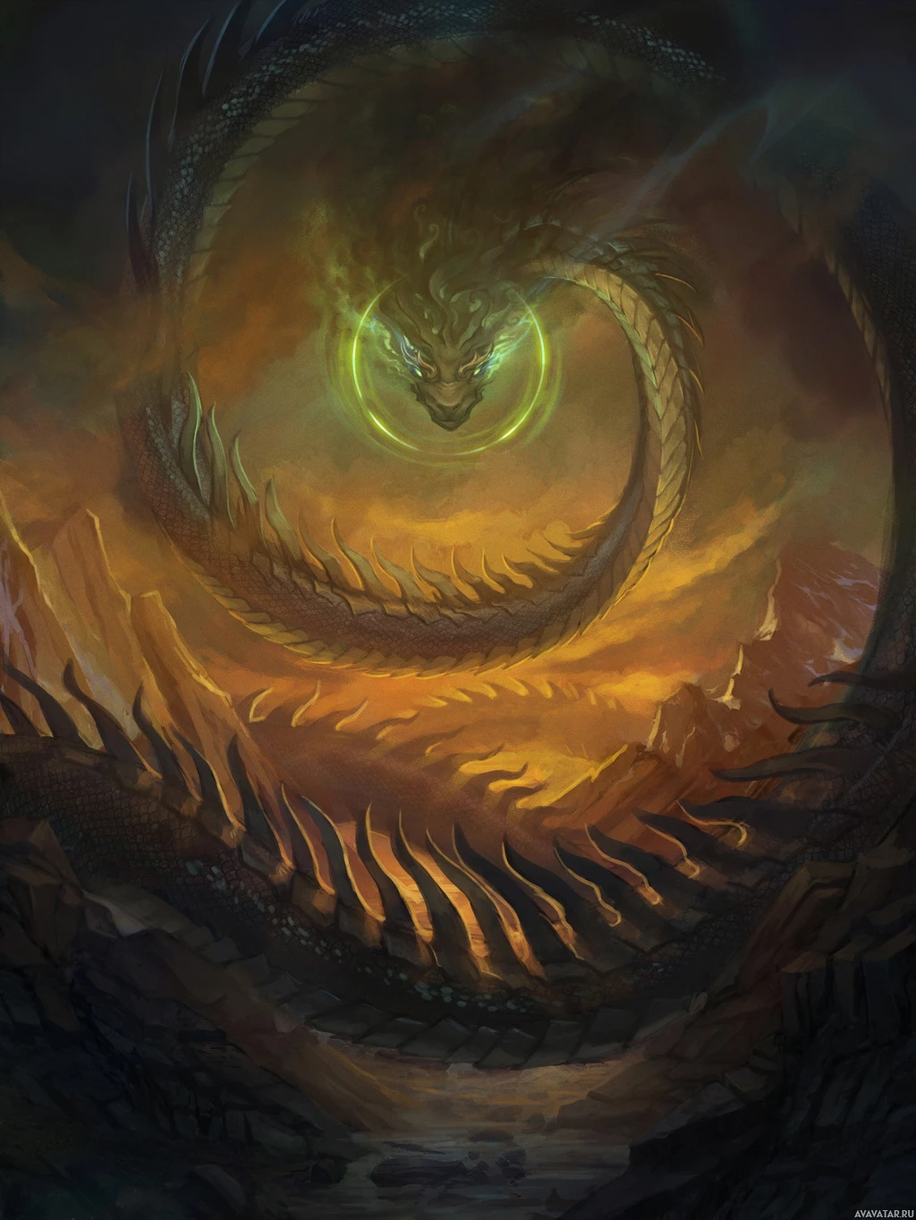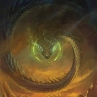 serpentine form, scales, wings, and possibly a tail, along with the characteristic fire or energy it emits. The background suggests