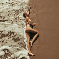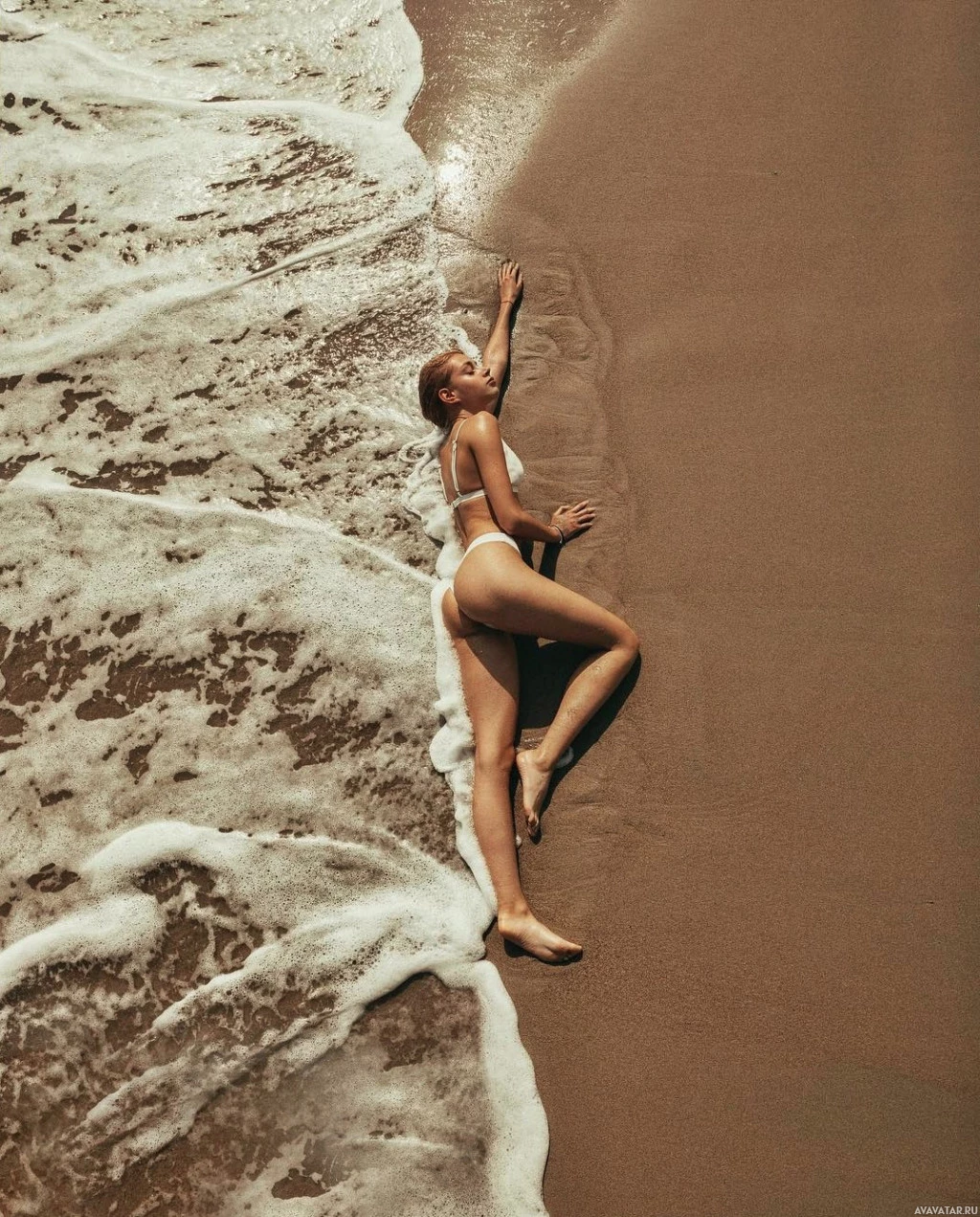 На картинке изображена женщина, лежащая на животе на мокром песке на краю воды, который кажется пляжем. Она носит белый купальник и, кажется, отдыхает после игры в океанских волнах. Сцена предполагает неторопливый день на пляже, когда женщина наслаждается солнцем и близостью к морю.