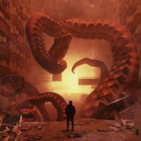 an ominous figure that resembles a large monster or creature with numerous tentacles or snakes wrapping around it, creating a sense of menace. The background appears to be a desolate