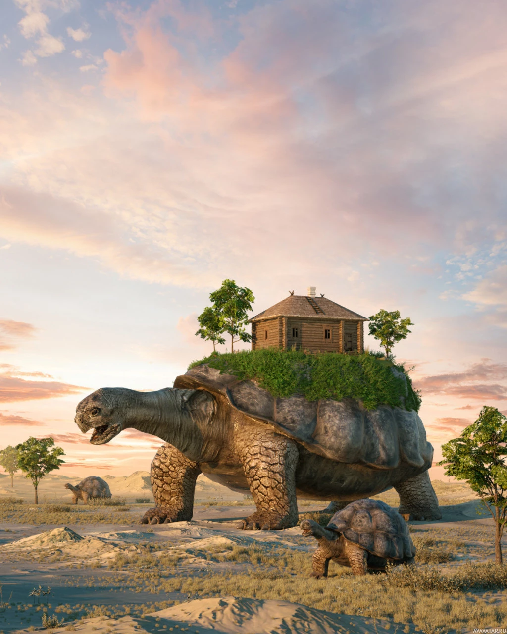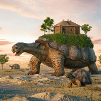a fantastical scene where two turtles are carrying a house on their backs. One turtle is larger and more prominently featured, while the other is smaller and positioned behind. Both turtles have visible shells with