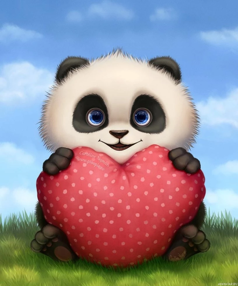 a clear sky with light blue hues. The panda is depicted in a cute and endearing manner, which is common for cartoon or whimsical artwork.