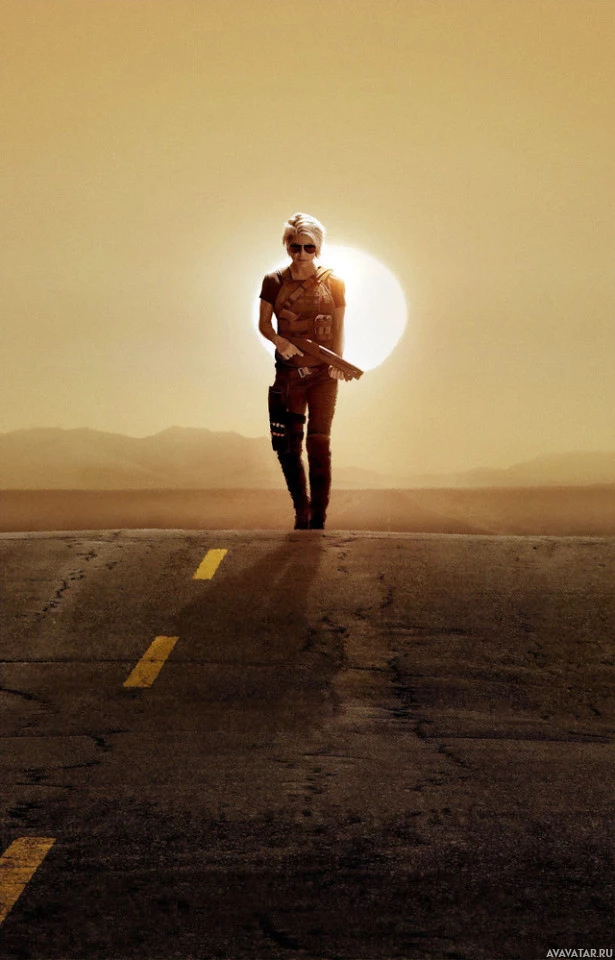 blonde hair, standing on a road under the sun. She is holding what seems to be a weapon, possibly suggesting that she is in a scene from a western or action film. The road is marked by