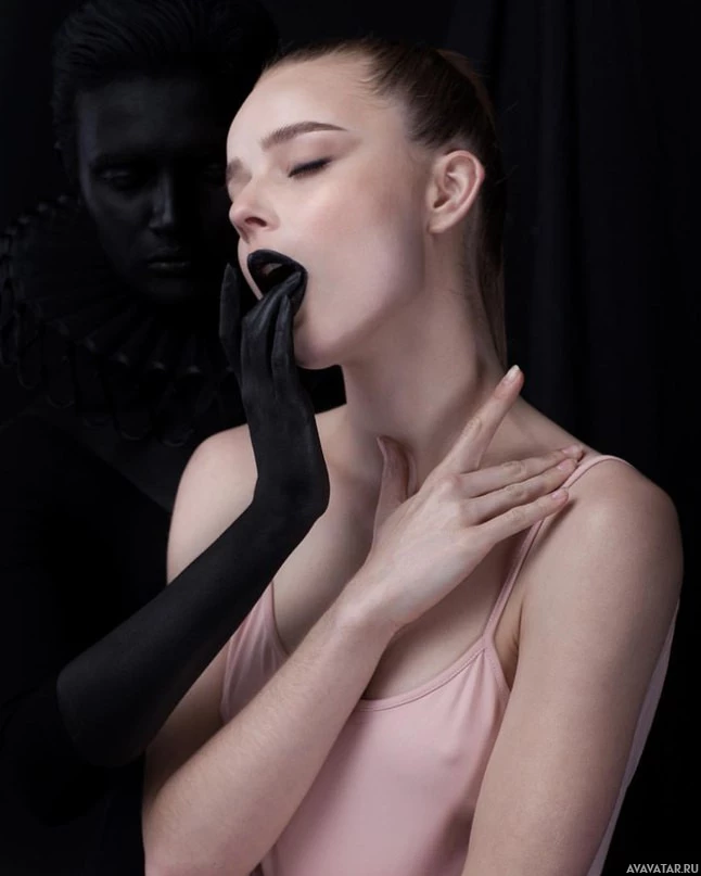 The image depicts a woman with her hands on her throat, as if she is being silenced or her voice is being muted. Beside her stands another figure, who appears to be an older man wearing