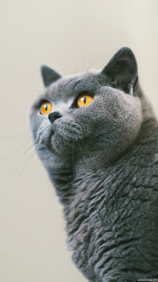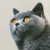 a British Shorthair or a similar type due to its dense fur and round face. It's sitting upright on its