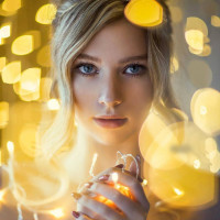 The image features a young woman with blonde hair, looking directly at the camera. She appears to be dressed in attire that might suggest a formal or festive occasion, possibly related to Christmas due to her holding a candle and the bokeh effect created by lights in the background. The focus of the image is on her face and upper torso, with the out-of-focus lights providing a warm glow around her figure.