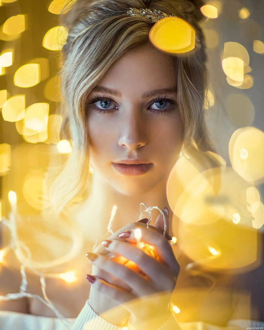 На снимке изображена молодая женщина со светлыми волосами, которая смотрит прямо в камеру. Похоже, что она одета в одежду, которая может указывать на официальное или праздничное событие, возможно, связанное с Рождеством из-за того, что она держит свечу и эффект боке, созданный огнями на заднем плане. Фокус изображения находится на ее лице и верхнем туловище, а внефокусные огни обеспечивают теплое свечение вокруг ее фигуры.