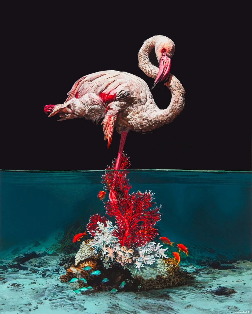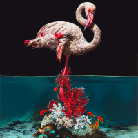 marine life, with the flamingo serving as a focal point above the richly detailed underwater environment.