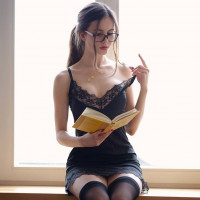 a window sill, reading a book. She is wearing glasses and