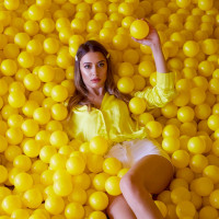 yellow balls. The woman appears to be at ease and may be playfully posing amidst