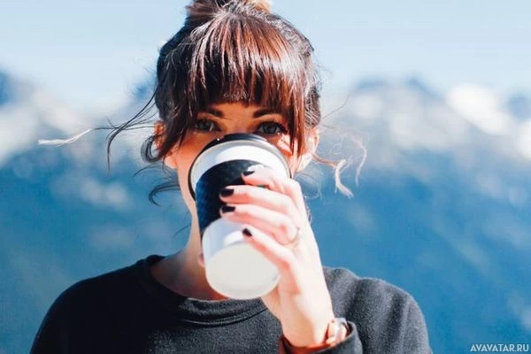 a coffee cup to her mouth, likely about to take a sip. She has medium-length hair and is wearing
