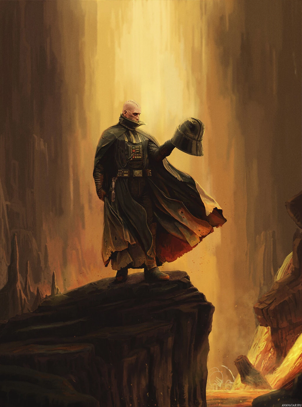 a rocky outcropping with a dramatic, possibly volcanic landscape in the background, suggesting an intense or ominous environment typical of scenes from the Star Wars universe. The character is wearing a cloak and helmet, which are iconic elements associated with