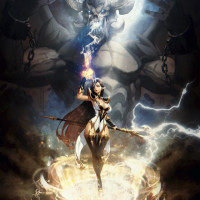 a fierce expression. The setting is dramatic, with dark clouds, lightning bolts, and an ominous