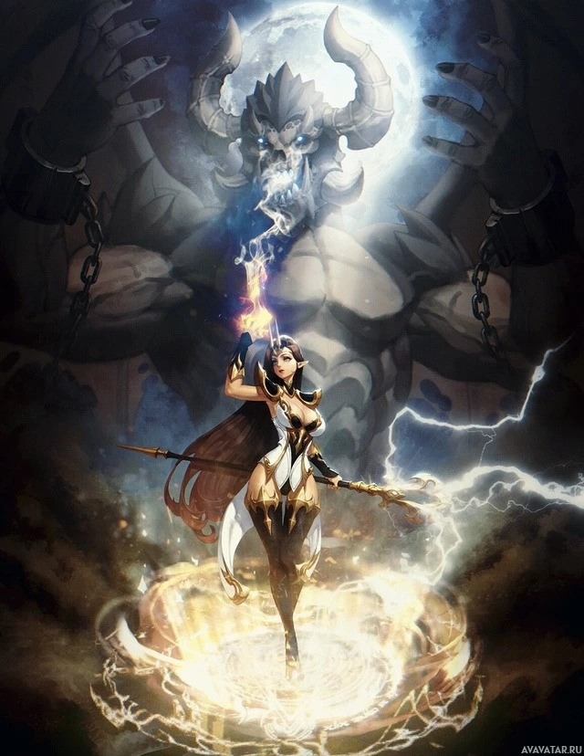 magical action. Behind the elf, there is a powerful figure resembling a demon or evil entity with menacing horns and