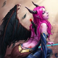an illustrated character that resembles a succubus from fantasy lore. She has wings and horns, typical of a demonic or