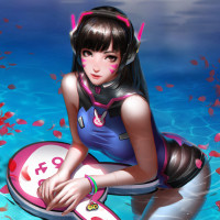 The image features an animated character named D.Va, known from the video game Overwatch. She is sitting in a swimming pool filled with cherry blossom petals floating on the water's surface. D.Va is wearing her signature tank top and headset, which are part of her gear as a warrior-hero in the game. The art style suggests it might be fan art or promotional material for the character.