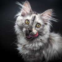 The image features a cat with a mix of gray, black, and white fur. It has