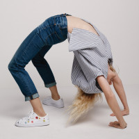 The image shows a person in a stretching pose. They are wearing casual clothing, including jeans and a striped top, with sneakers on their feet. Their head is tilted down, and they appear to be focused on the stretching exercise. The background is neutral and does not distract from the subject of the photo.