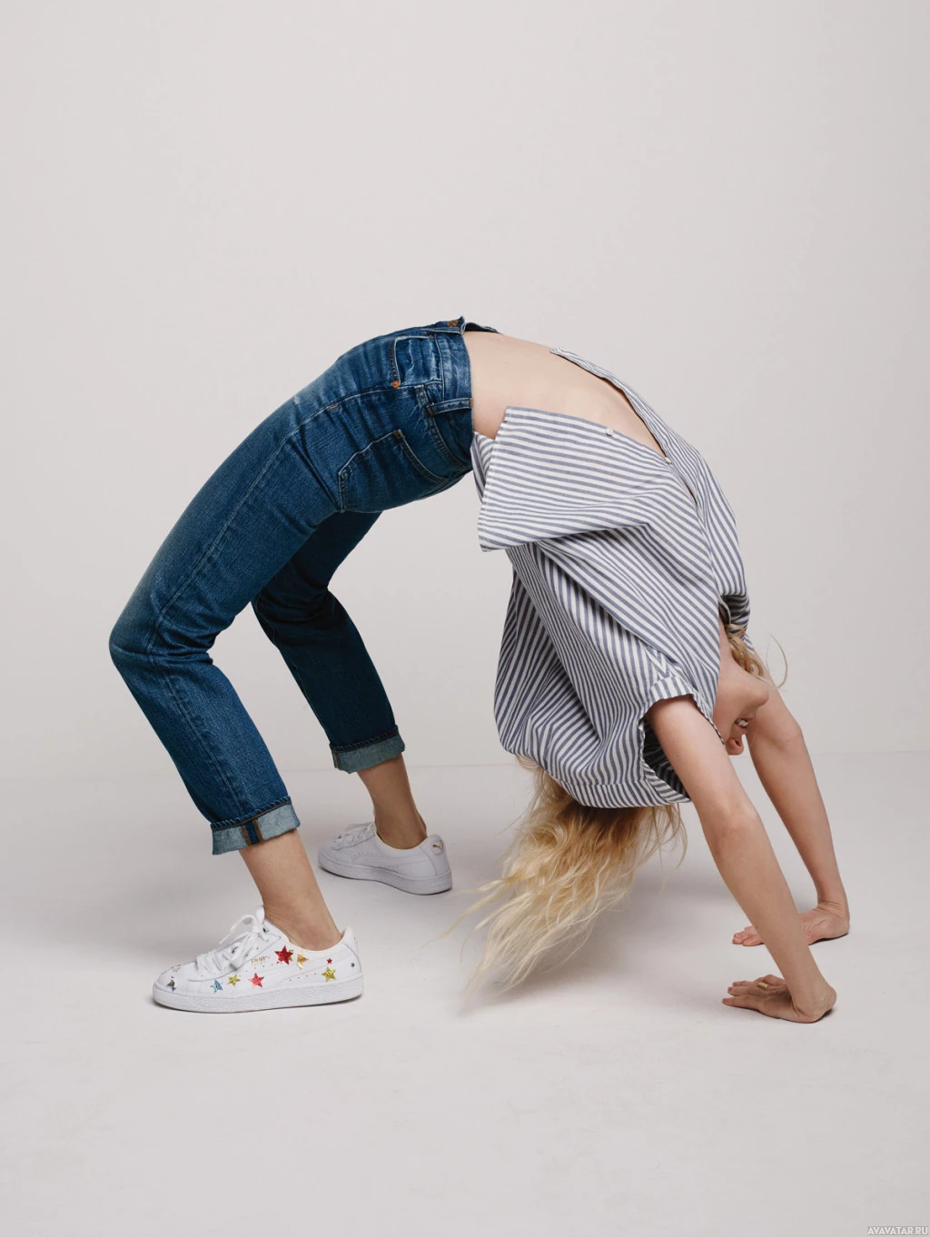 Картинка показывает человека в растягивающей позе. Они носят повседневную одежду, включая джинсы и полосатый верх, с кроссовками на ногах. Их голова наклонена вниз, и они, кажется, сосредоточены на упражнениях на растяжку. Фон нейтральный и не отвлекает от темы фотографии.