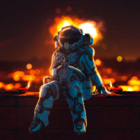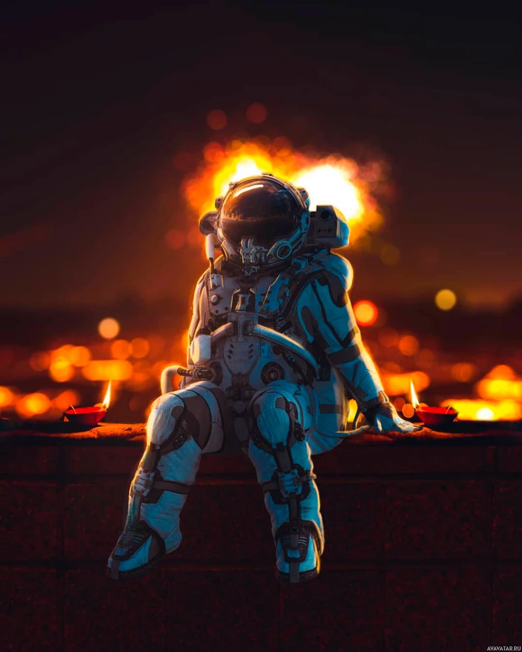 This image features an astronaut sitting on a ledge. The astronaut is depicted wearing a spacesuit, and the background suggests a nighttime setting with flames or lights visible in the distance. It's a digital artwork that portrays a person from