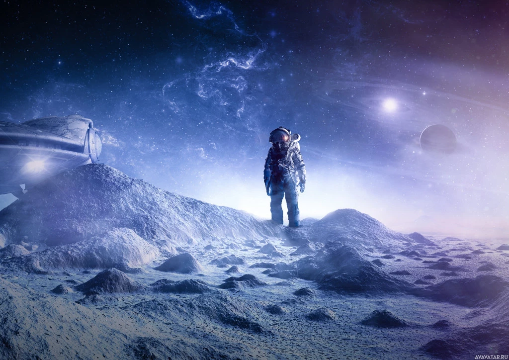 The image features an astronaut on the surface of a rocky