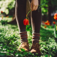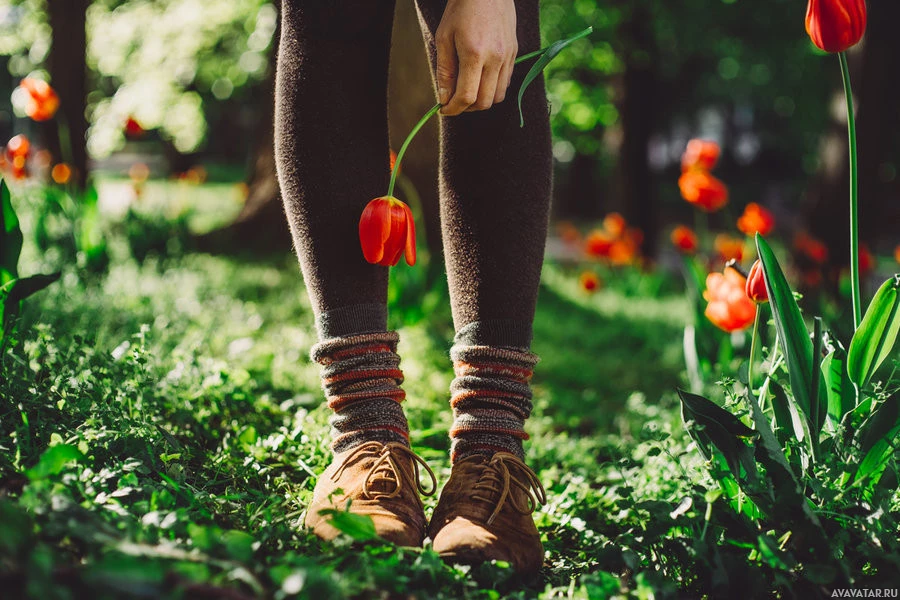 a grassy area with red tulips scattered around them. The individual is looking down at their shoes or something on the ground near their feet.