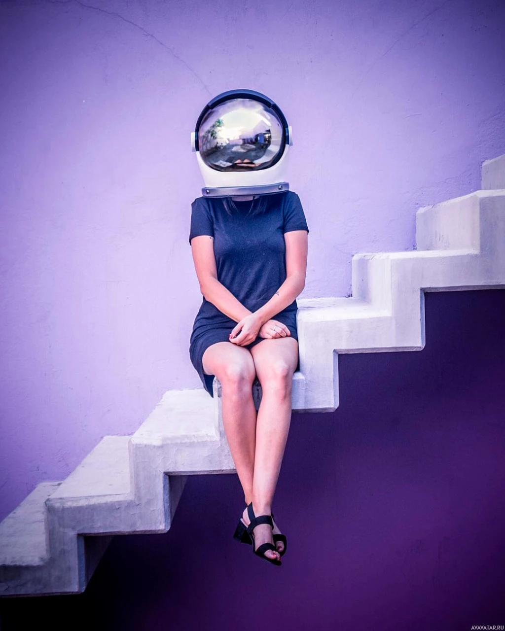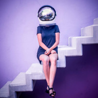 The image shows a person sitting on some steps with their legs crossed. They are wearing a helmet that resembles the one typically worn by astronauts, and they appear to be looking upwards. The background is purple, which adds