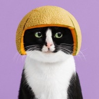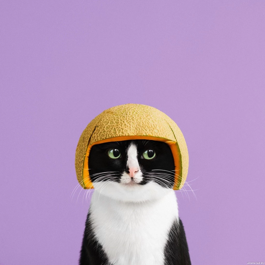The image features a black and white cat standing upright. On its head is a yellow melon, which has been cut in half to fit snugly around the cat's face like a helmet or