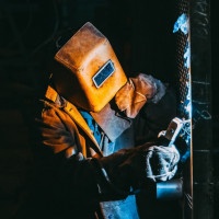 На снимке изображен человек, одетый в защитную одежду и снаряжение, вероятно, сварщик или металлист. Этот человек работает над куском металла, возможно, сварки или формирования его с помощью инструментов, в промышленных условиях. Сцена изображает задачу, требующую концентрации и мастерства, такую как ремонт или создание структурных компонентов.
