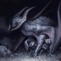 sharp teeth, while its head resembles a demonic creature's face. This creature is depicted nurturing three smaller creatures that look similar to it, suggesting a familial relationship or caregiving behavior, which adds an unexpected, tender element to the otherwise menacing appearance of
