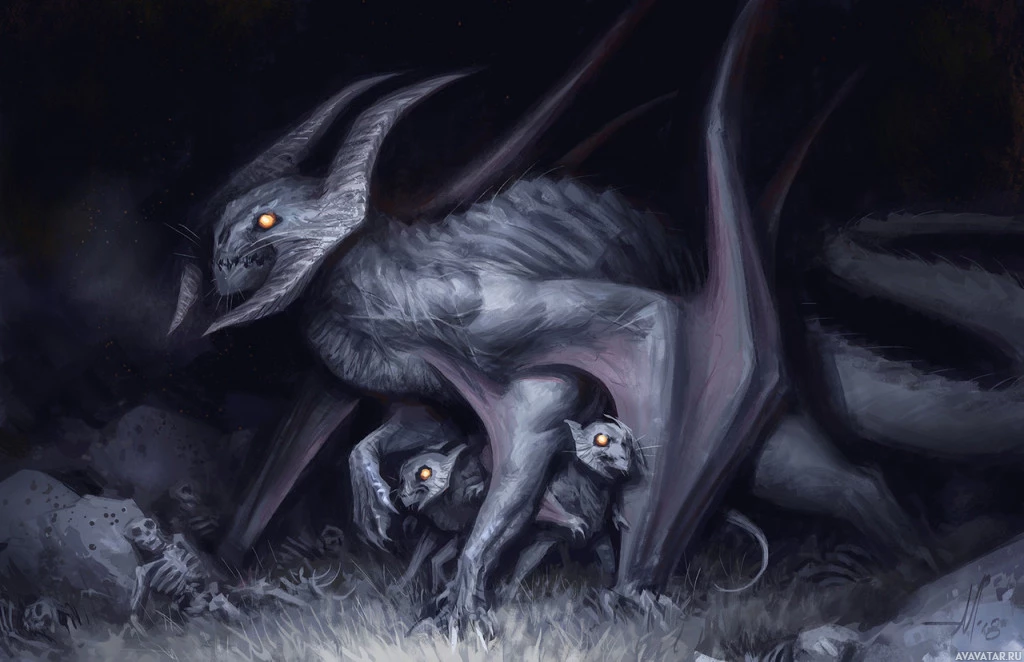 The image features a fantasy-themed illustration of a creature that appears to be a hybrid between a demon and a dragon. It has the body of a dragon with wings, spiky horns, and