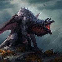 sharp teeth and wings that appear powerful and well-developed. In the background, there's a misty or cloudy sky with what appears to be