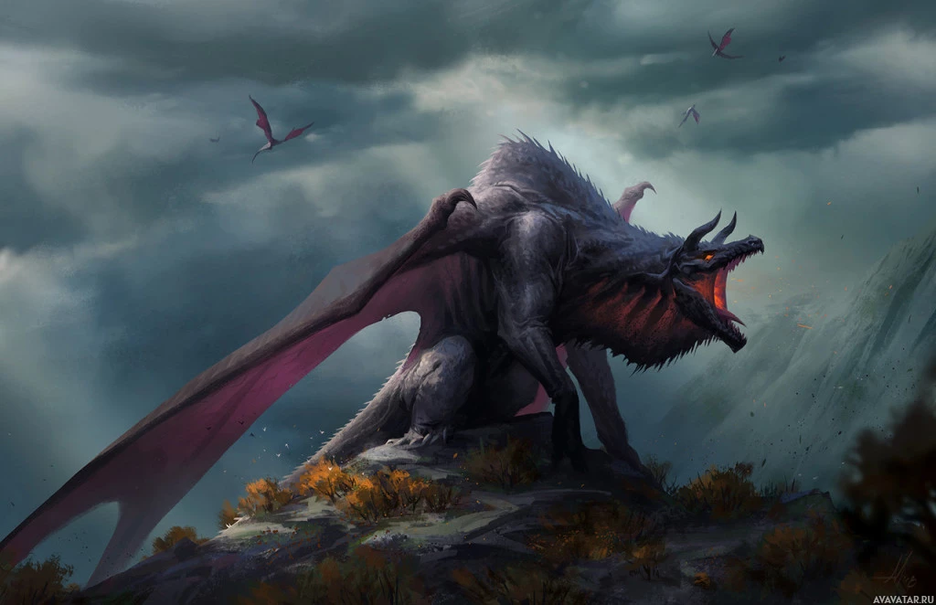 a fantasy scene featuring a large, fierce-looking dragon perched on top of a rocky outcrop. The dragon is characterized by
