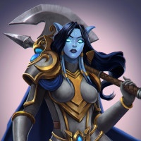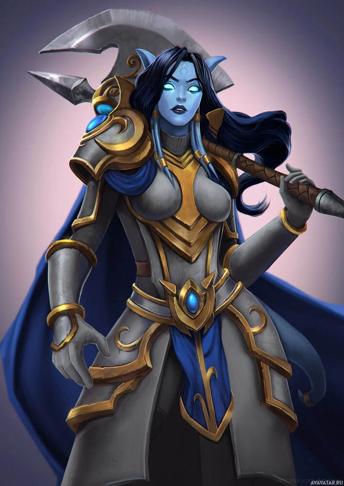 a female character with striking blue skin and an ornate helmet. She is holding a large axe and wearing what appears to be armor, suggesting she might be from the game "Warcraft" and possibly a member of the Draenei race, known for their
