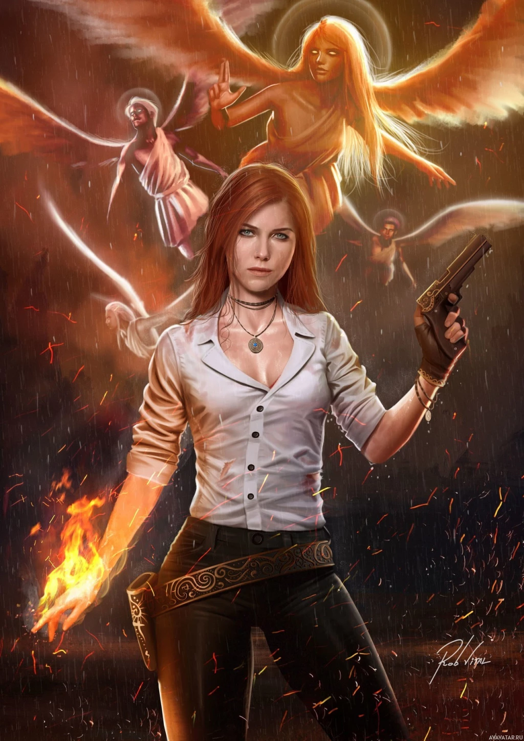 a female character with red hair, wearing a white shirt and black pants. She is holding a handgun in one hand while the other hand is holding a pair of wings. Behind her, there are