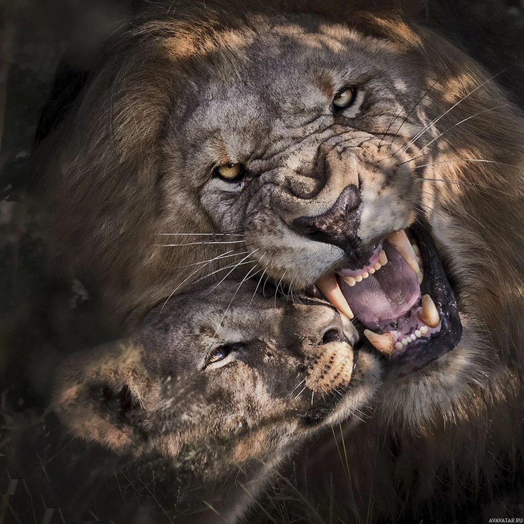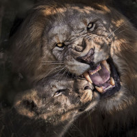 lion cub standing close by, and it appears that the adult lion is attempting to bite the cub. This