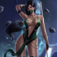 На картинке изображен персонаж из видеоигры «Смертельная битва». Это Джейд, один из персонажей игры. Она изображена с интенсивным выражением и носит свой фирменный наряд, который включает зеленый костюм, черную маску с белыми глазами и пару мечей. Фон предполагает боевую или боевую обстановку, типичную для серии Mortal Kombat.