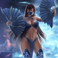 a female character who resembles Kitana from the video game series "Mortal Kombat." She is wearing a blue and silver outfit that includes a top with blue straps, gloves with