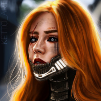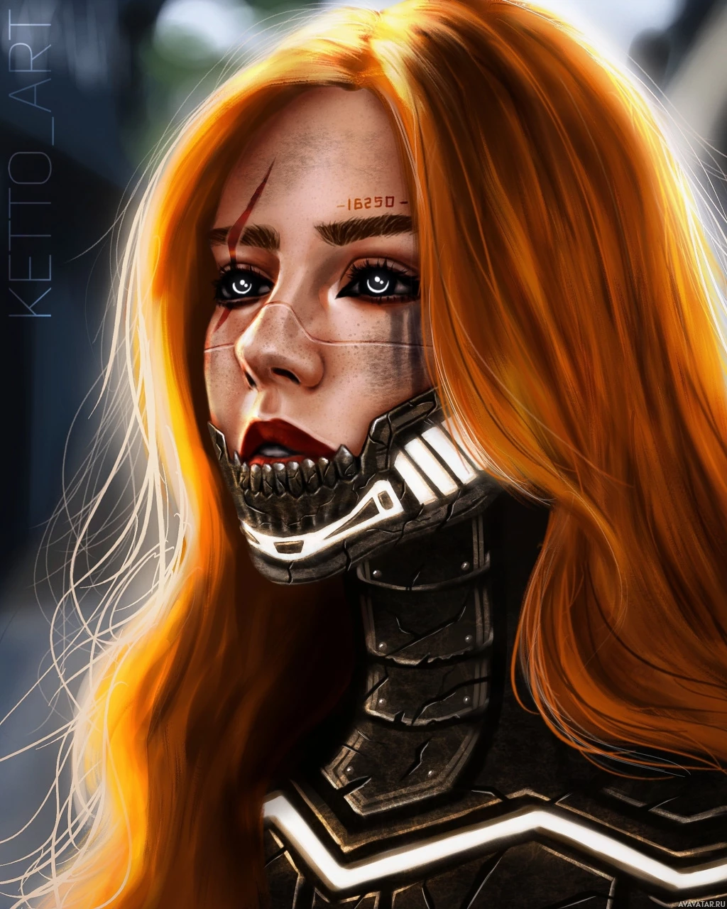 red hair and blue eyes. She has a cybernetic or robotic appearance, with visible mechanical components suggesting she is part human, part machine, which aligns with