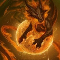 a serpent with wings and is surrounded by flames, giving it an imposing and mystical appearance. The creature is set against a backdrop that seems to represent a celestial or magical environment, possibly