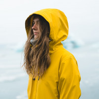 long hair wearing a bright yellow raincoat and a hood. They are standing near the water's edge, possibly on a beach or