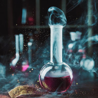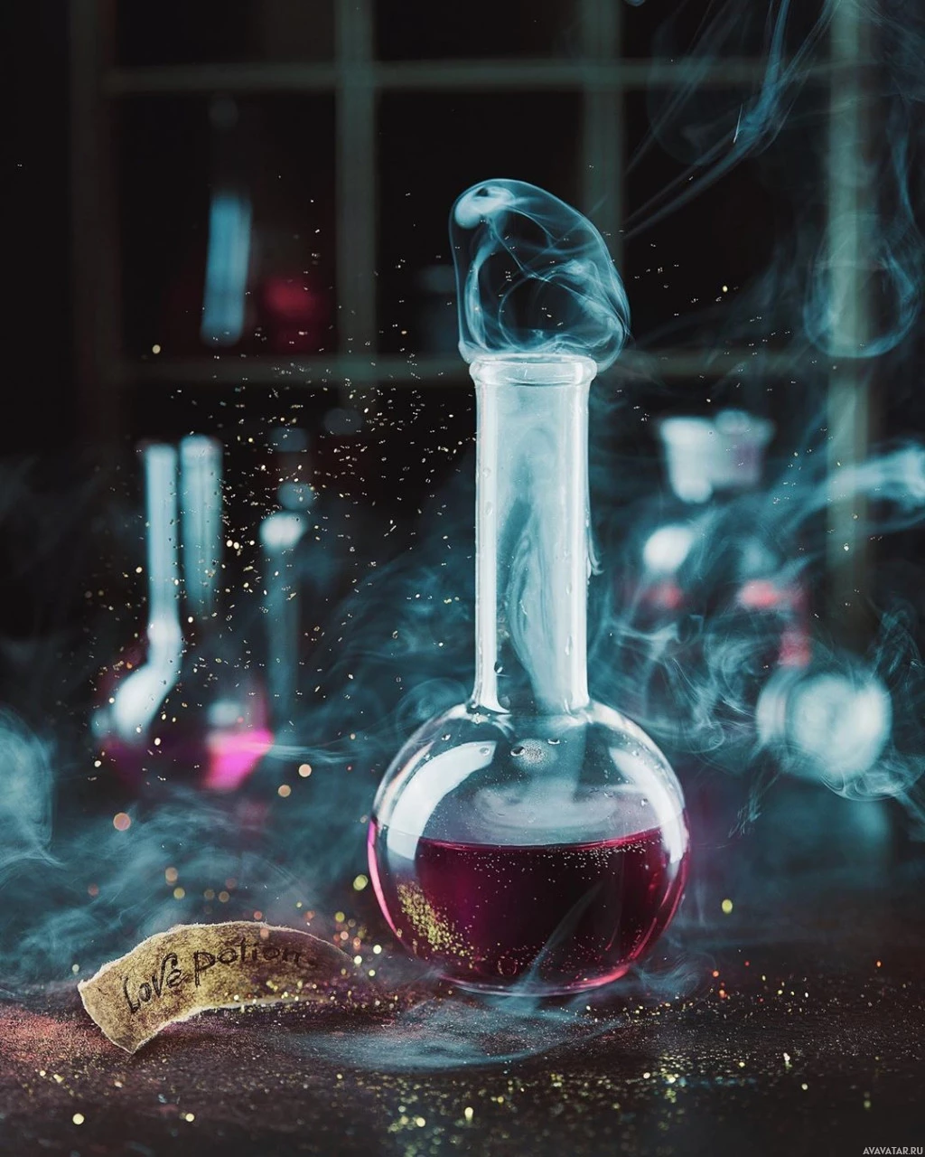 a glass bottle with a label that appears to say "Love" or "Love Potion." The bottle is placed on what looks like a laboratory table with various chemical apparatus, suggesting the setting of an alchemist's workshop. Smoke or fog is emanating from the top of the bottle, and there are some additional elements that contribute to the magical or mystical atmosphere, such as glittering particles and what might be